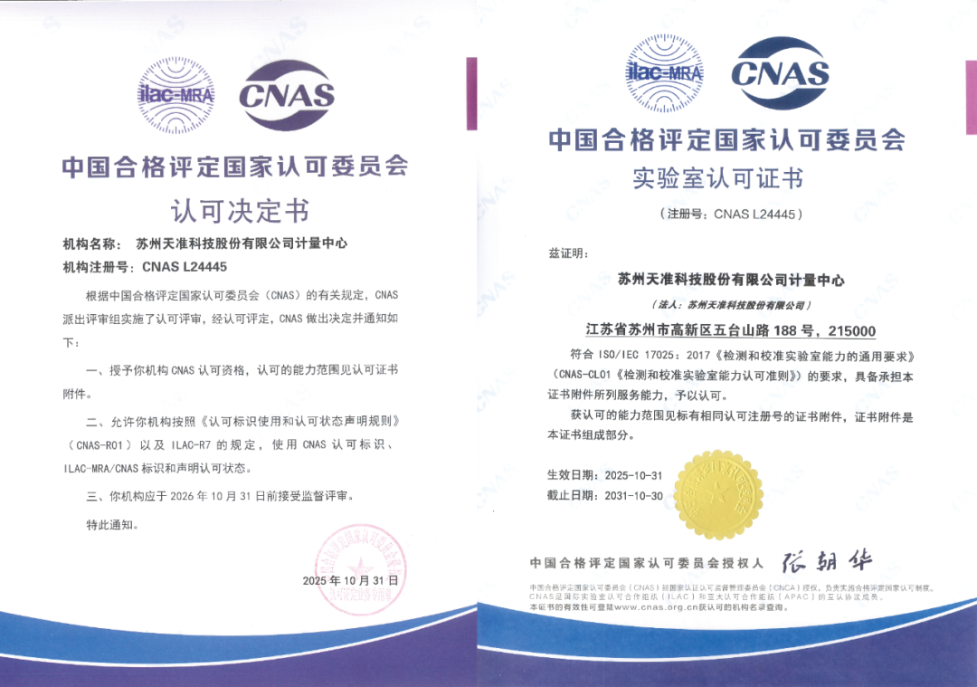 近日,苏州天准科技股份有限公司计量中心通过中国合格评定国家认可委员会(CNAS)评审,正式获颁实验室认可证书(注册号:CNAS L24445)。这标志着天准计量中心的技术实力与质量管理体系不仅获得国家级权威认证,更取得了国际互认的“通行证”,为天准的技术创新构筑起通向全球市场的坚实基石。